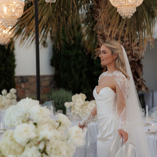 A refined palette of whites, creams, and greens set the stage, enhanced with crystal chandeliers, glowing candlelight, and elegant table settings. Seashell details wove in a subtle nod to the coastline, balancing luxury with place-specific charm.